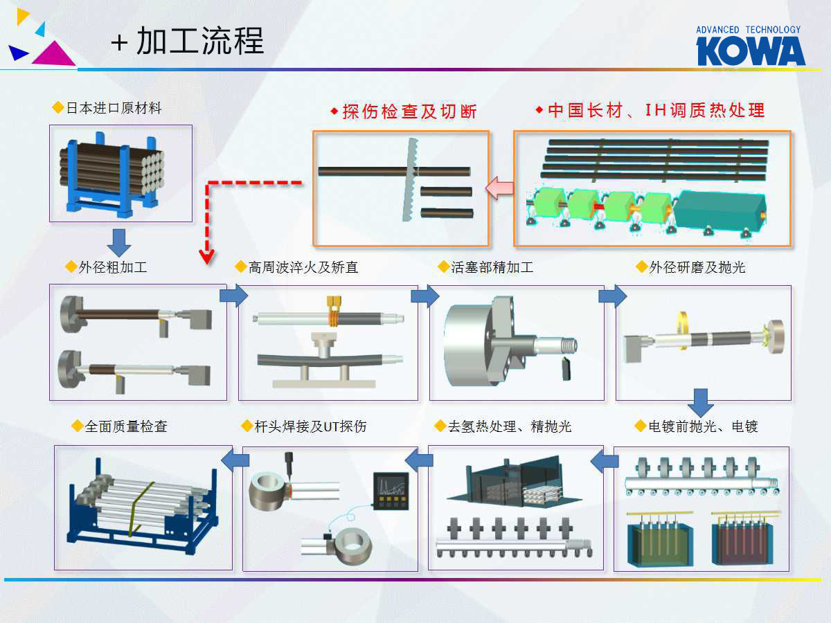 公司生產(chǎn)液壓挖掘機等建設(shè)機械用活塞桿,從原材料調(diào)質(zhì)熱處理到數(shù)控加工、表面電鍍鉻,至完品檢查出荷,實現(xiàn)了自動化生產(chǎn)。
