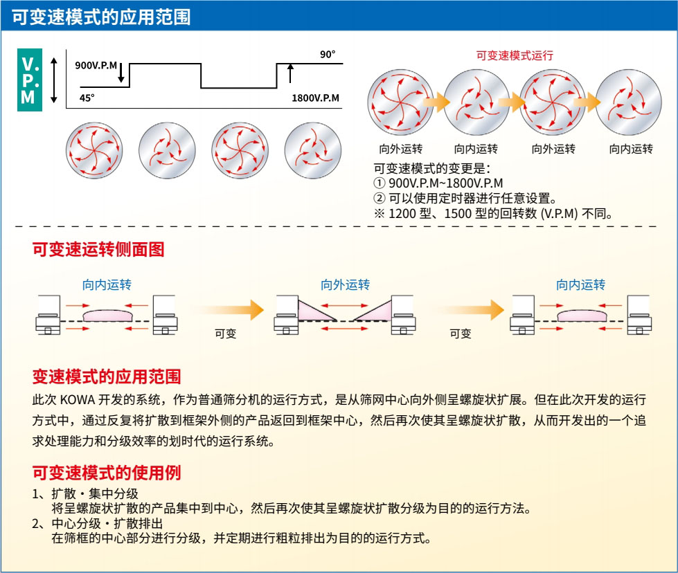 可對(duì)應(yīng)全機(jī)種(KV、KI、KL 除外);在連續(xù)運(yùn)行中分級(jí)精度 10%UP;通過改變轉(zhuǎn)速 以改變流動(dòng)方式