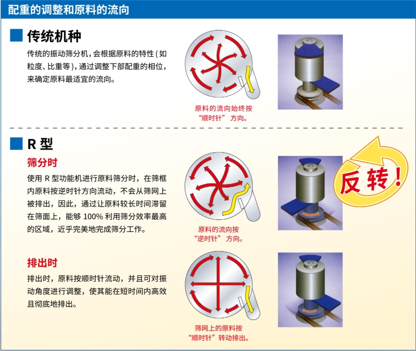 傳統(tǒng)的振動篩分機(jī),是通過調(diào)整振動體下部配重的相位,來控制原料的流動位置。