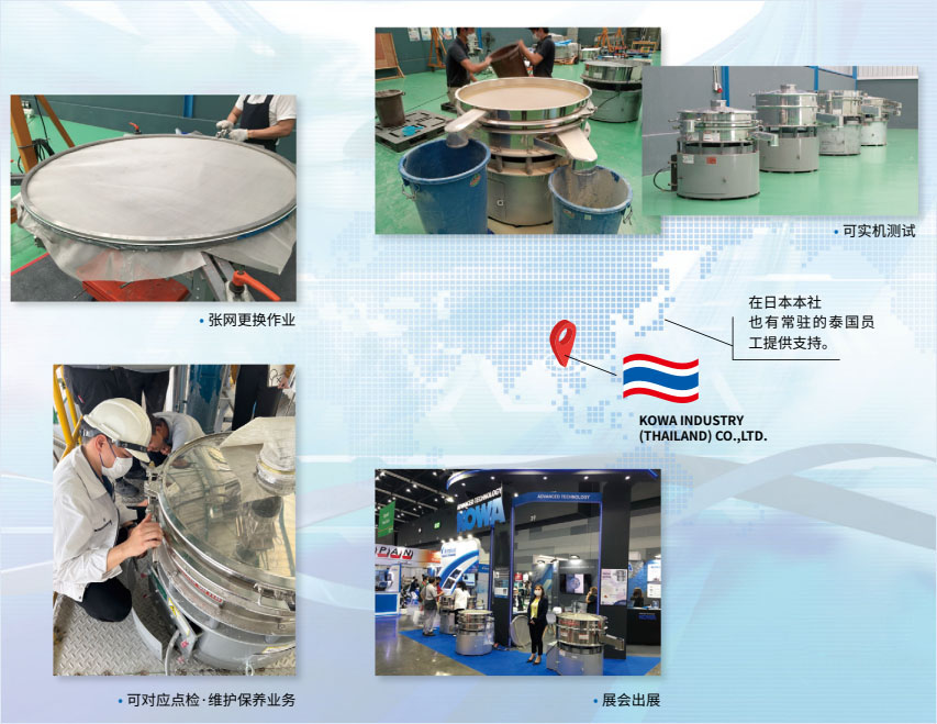 公司位于泰國曼谷郊外,從開展泰國國內(nèi)的保養(yǎng)維護業(yè)務(wù)起步,作為亞洲地區(qū)的銷售據(jù)點于 2016 年 3 月設(shè)立。自 2020年起,我們開始在泰國進行篩分機的組裝業(yè)務(wù),著力打造讓海外客戶也能安心使用產(chǎn)品的環(huán)境。今后,我們也將在海外實現(xiàn) “與日本本土一致的優(yōu)質(zhì)服務(wù)” 為目標(biāo)繼續(xù)努力。